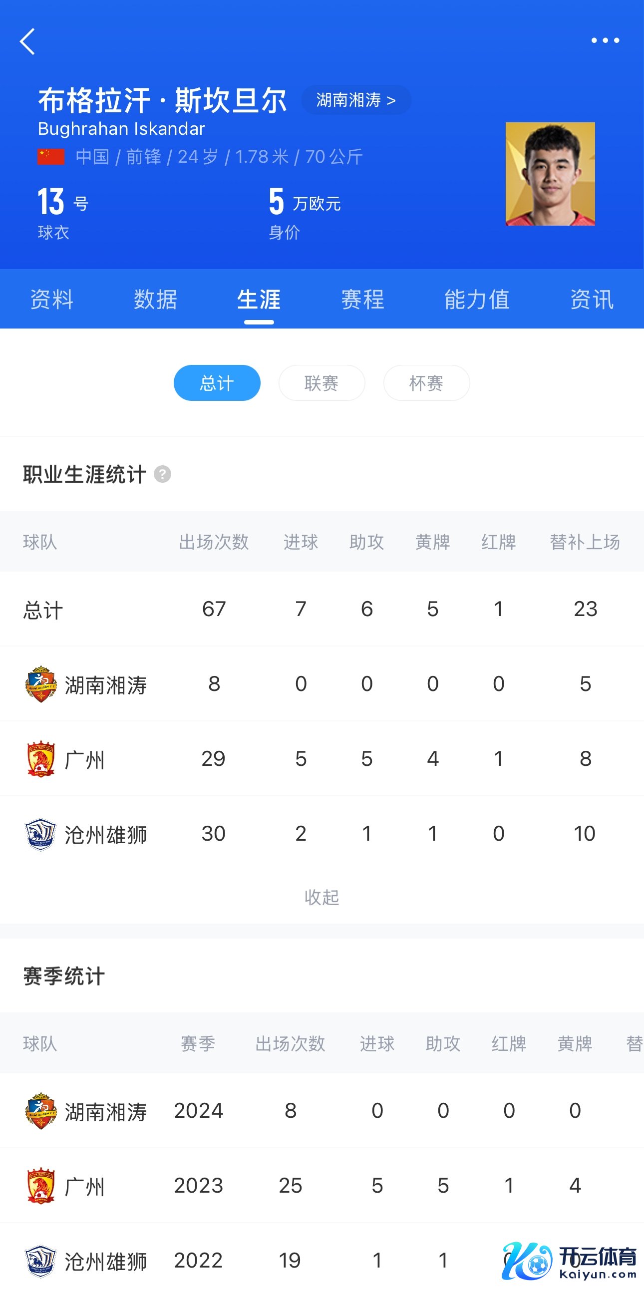 布格拉汗现年24岁,布格拉汗2019年被上调至广州一线队,2021年加盟沧州雄狮,2023年离开沧州雄狮重返广州队,2024年加盟成都蓉城,租赁至湖南湘涛半年。 沧州雄狮依然官宣退出做事联赛,终结;湖南湘涛,也依然文书退出做事联赛;广州队未获取准入,能够率终结。 体育集锦