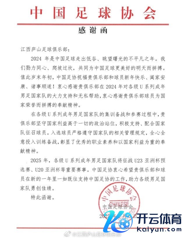 一封来自中国足协的感谢函体育录像/图片